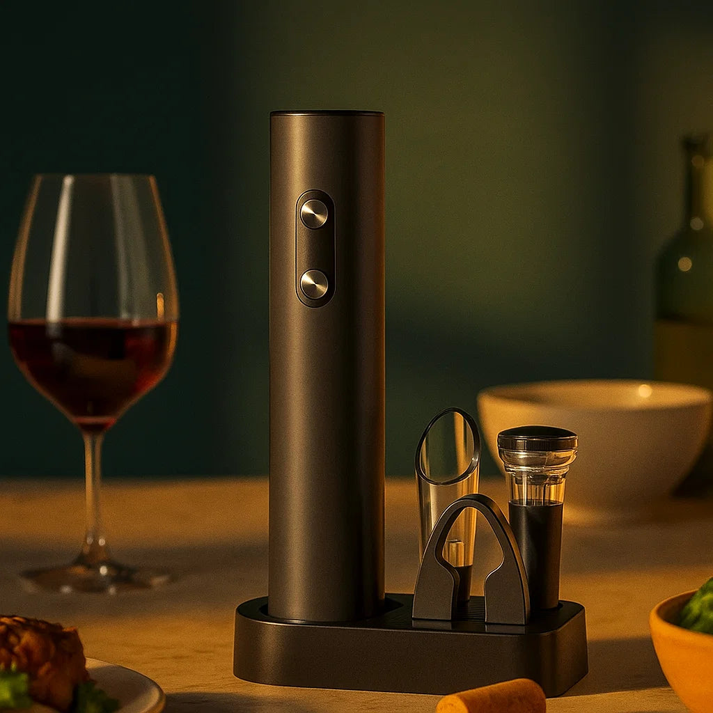 Este Kit Elétrico para Vinho transforma cada abertura de garrafa em um pequeno ritual — com tecnologia silenciosa, materiais de alta durabilidade e estética refinada.
